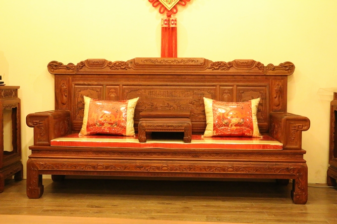 該款沙發(fā)整體之表現(xiàn)顯得極為嚴(yán)密厚實(shí),無一處鏤空之雕飾,在最上端背板處的中間部分為留有一些花紋之邊幅加以修飾,顯得極為浮美雅觀。而在其左右兩側(cè)則另雕繪有“麒麟戲珠”與“雛鳥朝鳳”兩處紋飾圖案:“麒麟戲珠”紋飾設(shè)計(jì)地較為特別,如草龍紋一般,除頭部精細(xì)雕刻外,其余四肢與形體均簡略化,身體部位采用一銜邊條帶狀的紋飾相串于圓珠內(nèi),頗顯靈動神韻;而“雛鳥朝鳳”的圖案則是在背板最上部的左右兩端,末端是饒有一圓弧之設(shè)計(jì)為修飾收尾,顯得極為婉轉(zhuǎn)柔和圓潤。紋飾的圖案為一只可愛的雛鳥深情脈脈含情注視著前方鳥鳳的場景,顯得實(shí)為溫馨。鳳凰處之設(shè)計(jì)處理地也與前面麒麟一同:頭部細(xì)化,其余簡略帶過,鳳凰處眼眸之雕飾顯得極為醒目,神情表現(xiàn)形態(tài)逼真,層次感和手觸感亦十分明瀝彰顯,而經(jīng)燙蠟處理的表面緬花材質(zhì)表現(xiàn)地也更為細(xì)膩淡雅,極盡奢華。
