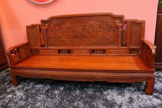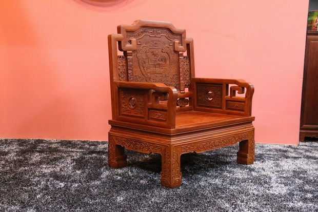 每一件紅木家具的起名,其實都是一個產品系列概念與寓意的體現,譬如在前面幾篇沙發系列介紹文章中有提到過的:表達福文化、吉祥文化的“富貴祥和沙發”、“福臨門沙發”;以歷史文化為題材背景,有借用了明代著名畫家仇英畫作的“漢宮春曉沙發”以及在座椅背板上雕刻有的王羲之作品《蘭亭序》之“壯志凌云沙發”;另外還有借鑒了現代元素并表達了作品寄語,特別為新東方總裁俞洪敏先生設計制作的“新東方沙發”。