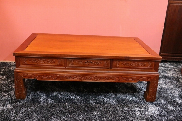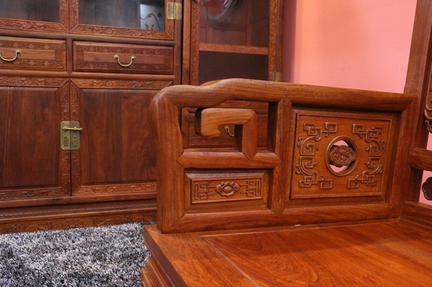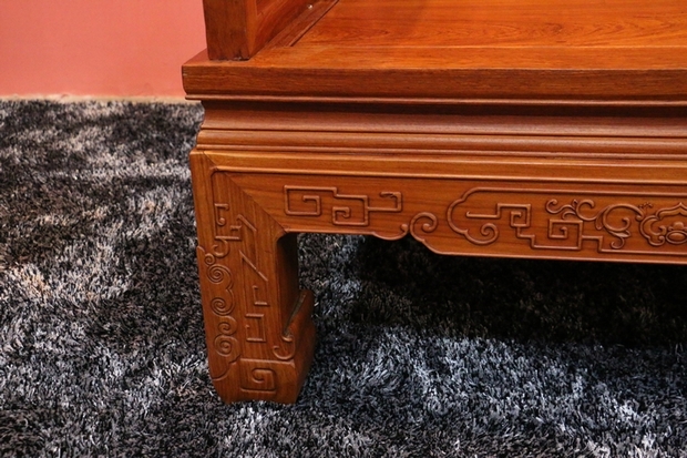 雕刻的主體圖案集中被描繪在了該塊沙發背靠板的正面中央位置,以作品主題為素材,幅以富麗的山川、嶙峋的怪石、靜雅的樓閣、樹木與清野等等,筆鋒干凈利落,刀法細膩深刻,簡單一副浮雕畫案便將人們的視野定格于作品的背板處,十分醒目。另外,該系列沙發產品,在每一件配套的家具用品之上都刻畫了各式各樣的幾何紋飾,彎延浮縷,連綿不絕,象征著那吉祥與好運長長久久,財源與富貴永不斷頭。此外,在沙發圖案中還多次運用到了如意形象紋飾,它非傳統偏直條形兩頭向內彎曲的形狀,采用了一個頭尾相接成圓狀,看似“頭箍”一般的圖形繪飾,在中間的交匯處嵌入以一顆美玉,有象征著吉祥富貴、祝福如意之寄寓。