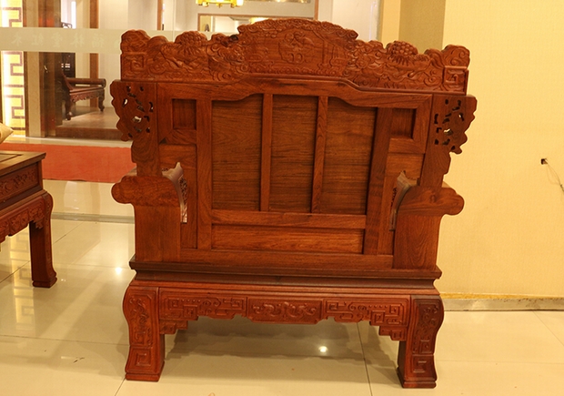 該款沙發(fā)整體的特點,較之其他沙發(fā)款式顯得更為豐滿完整,其靠背板處的鏤空面積極少,僅單單在背板的底部靠近扶手的左右兩側以及其上方懷抱元寶的兩處侍童處存有。在背板的最上端,左右兩側,雕刻有兩只憨態(tài)可掬而又威風凜凜的麒麟,然后在其中間位置,則是一對母子在簾倚之下倚靠著圓凳幸福生活的溫馨畫面。談到麒麟,在民間有"麒麟送子"的說法,它對老百姓而言,是送子神獸,據(jù)傳中國古代大思想家孔子即為麒麟所送,它是吉祥的象征,可以為人們帶來子嗣,也可保佑其平安聰慧賢德。