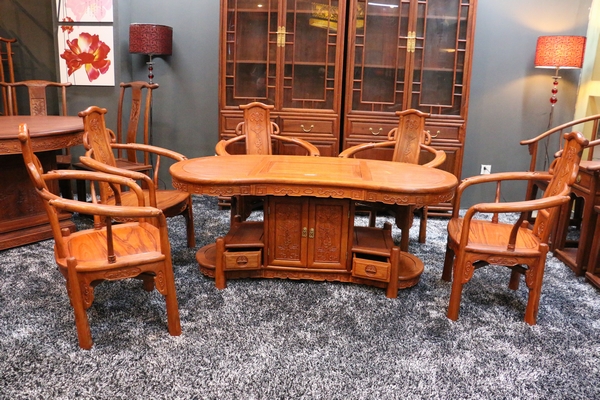 一套線條流暢、制作工藝精致的志成紅木茶臺,加上枝條類的東方插花,一搭一配中,盡顯茶室的和、靜、清、寂......